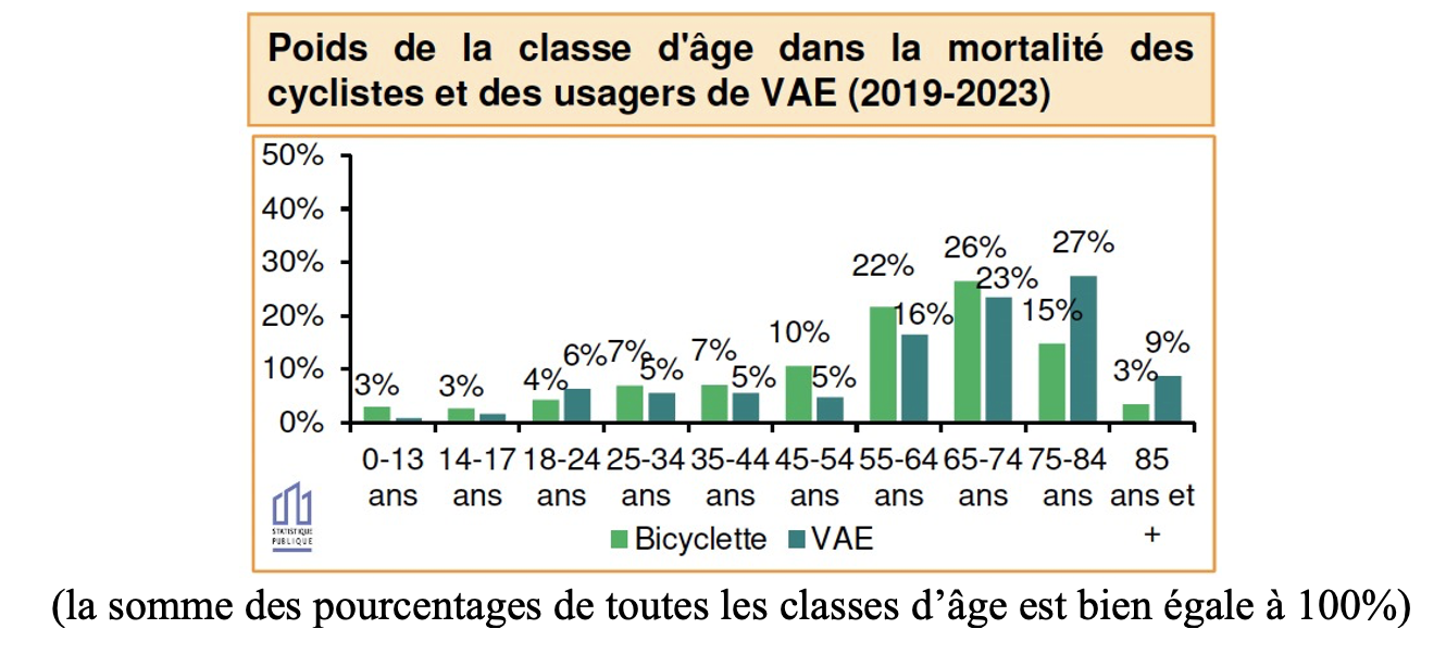 - après 85 ans, il faut constater que l’usage du VAE ne retombe pas et entraîne même une part de mortalité importante de 9%, le risque étant accru par les vitesses que peuvent atteindre les VAE.