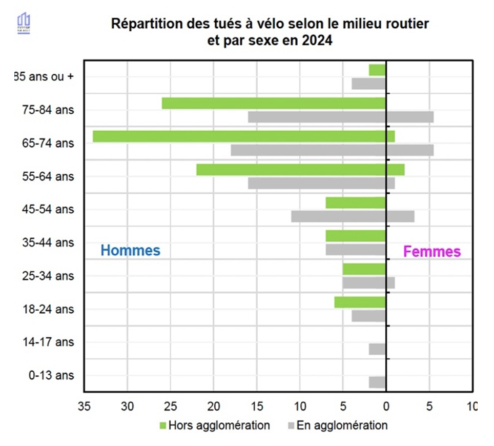 Le tableau ci-dessous, établi selon les dernières données de 2024, montre la mortalité des cyclistes selon l’âge et le sexe et selon le milieu (en ou hors agglomération).