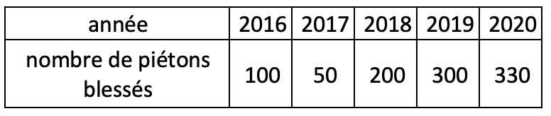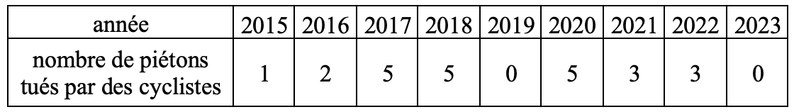 Pour fixer les idées, le tableau ci-dessous montre un ordre de grandeur du nombre de blessés par collision piéton-cycliste lors des cinq années récentes 2016 à 2020 :