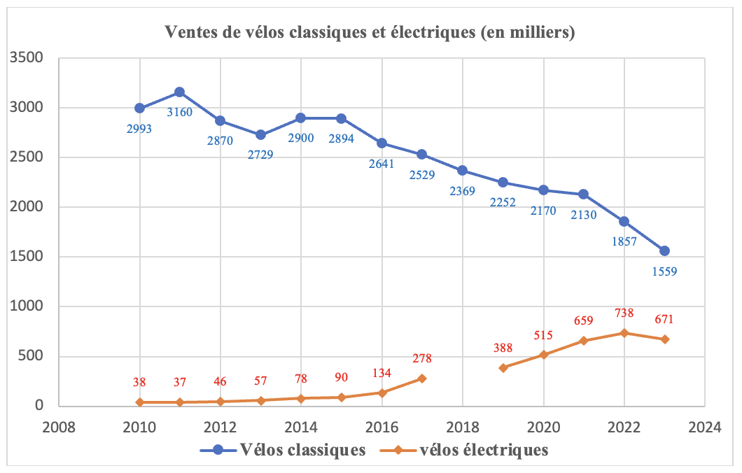 À partir de 2015, la vente des VAE décolle pour atteindre 738.000 en 2022, mais diminue de 9% en 2023, tout en représentant 43% des ventes de vélos classiques