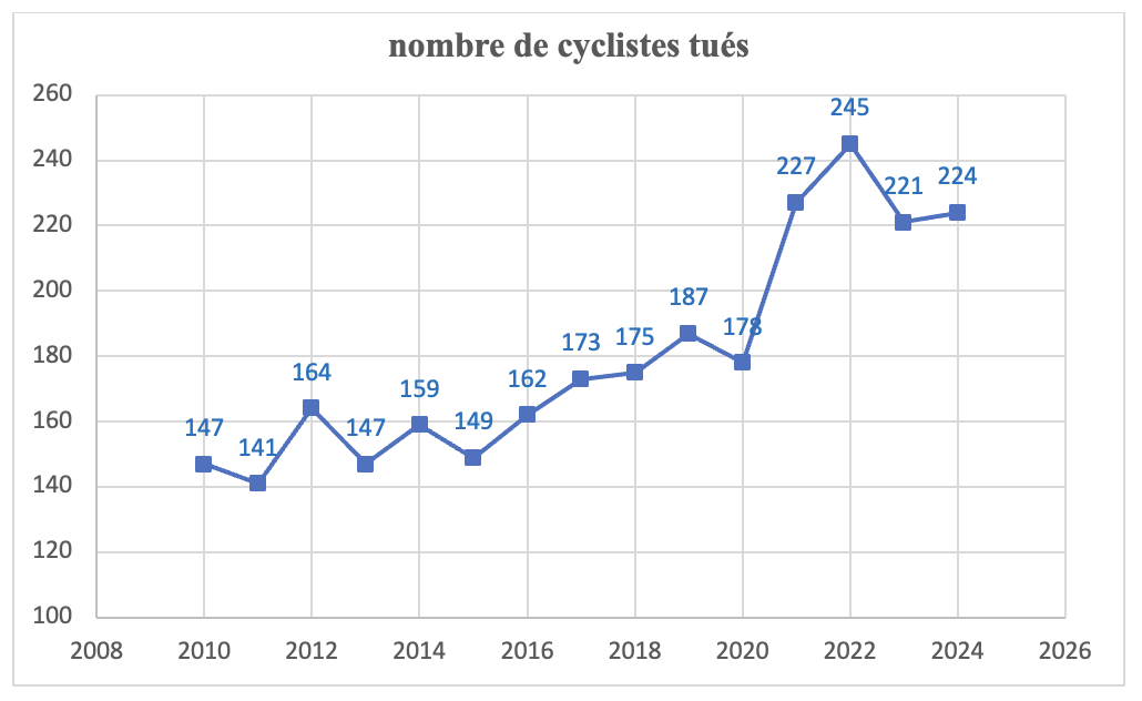 Après une relative stabilité entre 2010 et 2016, une rupture s’établit avec une augmentation systématique de la mortalité des cyclistes jusqu’en 2023, dernier résultat connu. L’augmentation affecte à la fois :