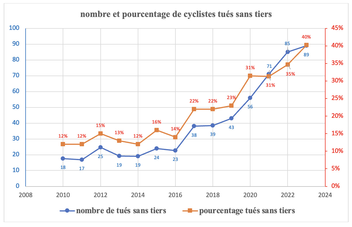 - le nombre de cyclistes tués sans tiers qui passe, entre 2016 et 2023, de 23 à 89 et est donc multiplié par 4, .