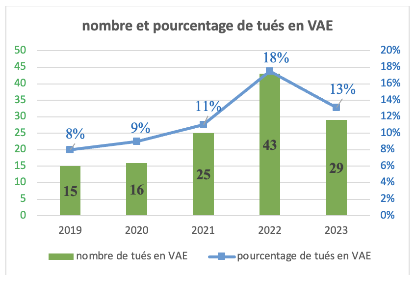 L’augmentation du nombre de cyclistes tués en VAE entre 2019 et 2022 accompagne l’augmentation du nombre de VAE en circulation. Plus inquiétant, est l’accroissement du pourcentage qui traduit peut-être l’augmentation du risque d’accident avec un VAE par rapport à un vélo classique, augmentation liée à la vitesse des VAE. Faute de données connues en 2024, la décroissance en 2023 ne peut être interprétée.
