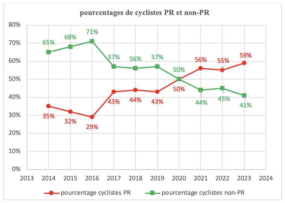 Le graphique ci-dessous montre les variations, durant la décade 2014-2023, du pourcentage de cyclistes tués dans des accidents où ils sont soit présumés responsables (PR) ou, au contraire, non-responsables (non-PR). Notons qu’un cycliste est présumé responsable lorsqu’il est tué dans un accident sans tiers, ce qui intervient avec un pourcentage compris entre 16% et 40% entre 2014 et 2023, comme précisé au § III.