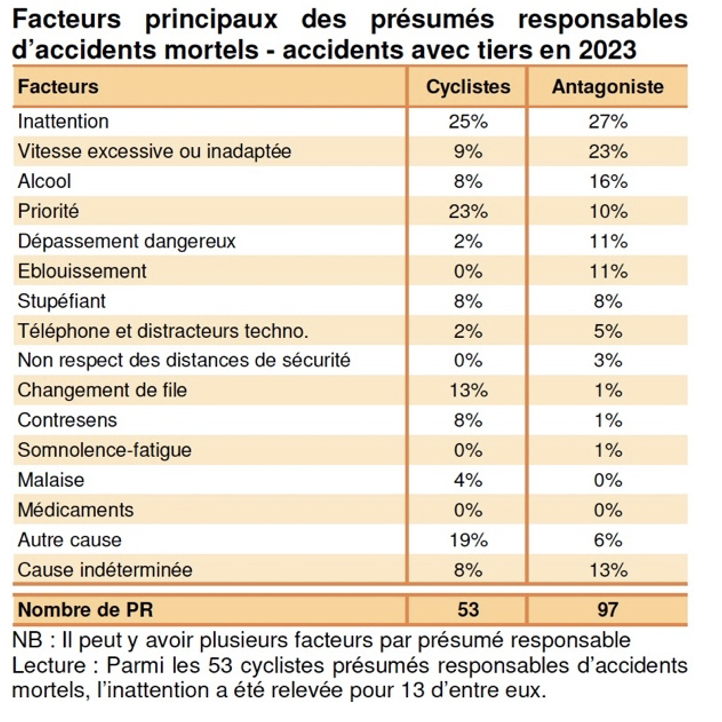 Le tableau ci-dessous répertorie les principaux facteurs à l’origine des accidents mortels avec tiers, commis par de présumés responsables (PR) et survenus en 2023. Il fait donc intervenir non seulement le cycliste impliqué dans l’accident, mais aussi le conducteur du véhicule avec lequel il est entré en collision, appelé ici « antagoniste ». C’est l’antagoniste qui est présumé responsable lorsque le cycliste ne l’est pas.