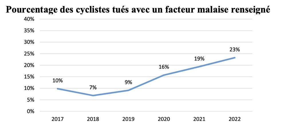 Ainsi, en cinq ans, le facteur malaise joue dans une proportion de cyclistes tués qui est plus que doublée, passant de 10% en 2017 à 23% en 2022.